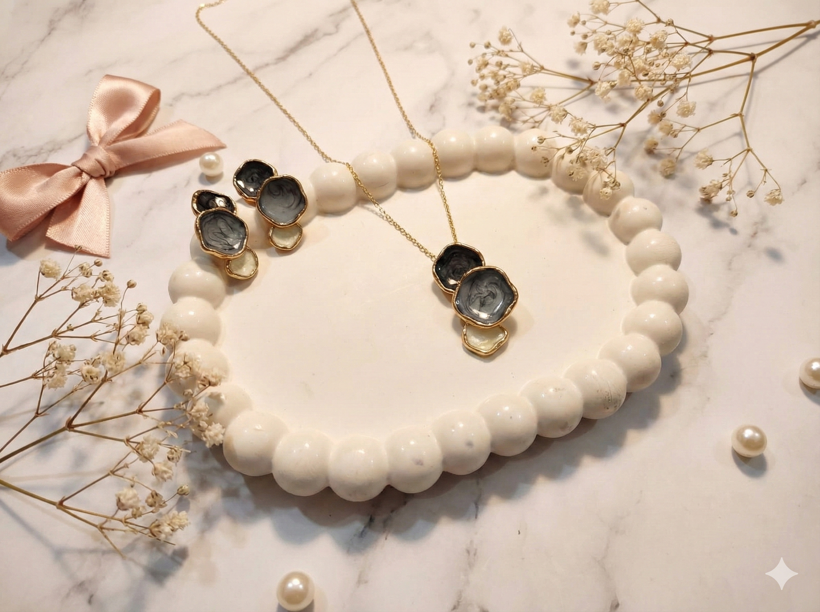 This Gold – Plated Anti Tarnish Grey Black and White Pendent Chain With Earrings  Elegant Design: Exquisitely crafted 18k gold- plated stainless steel Bow Earrings with a sleek, minimalist design.