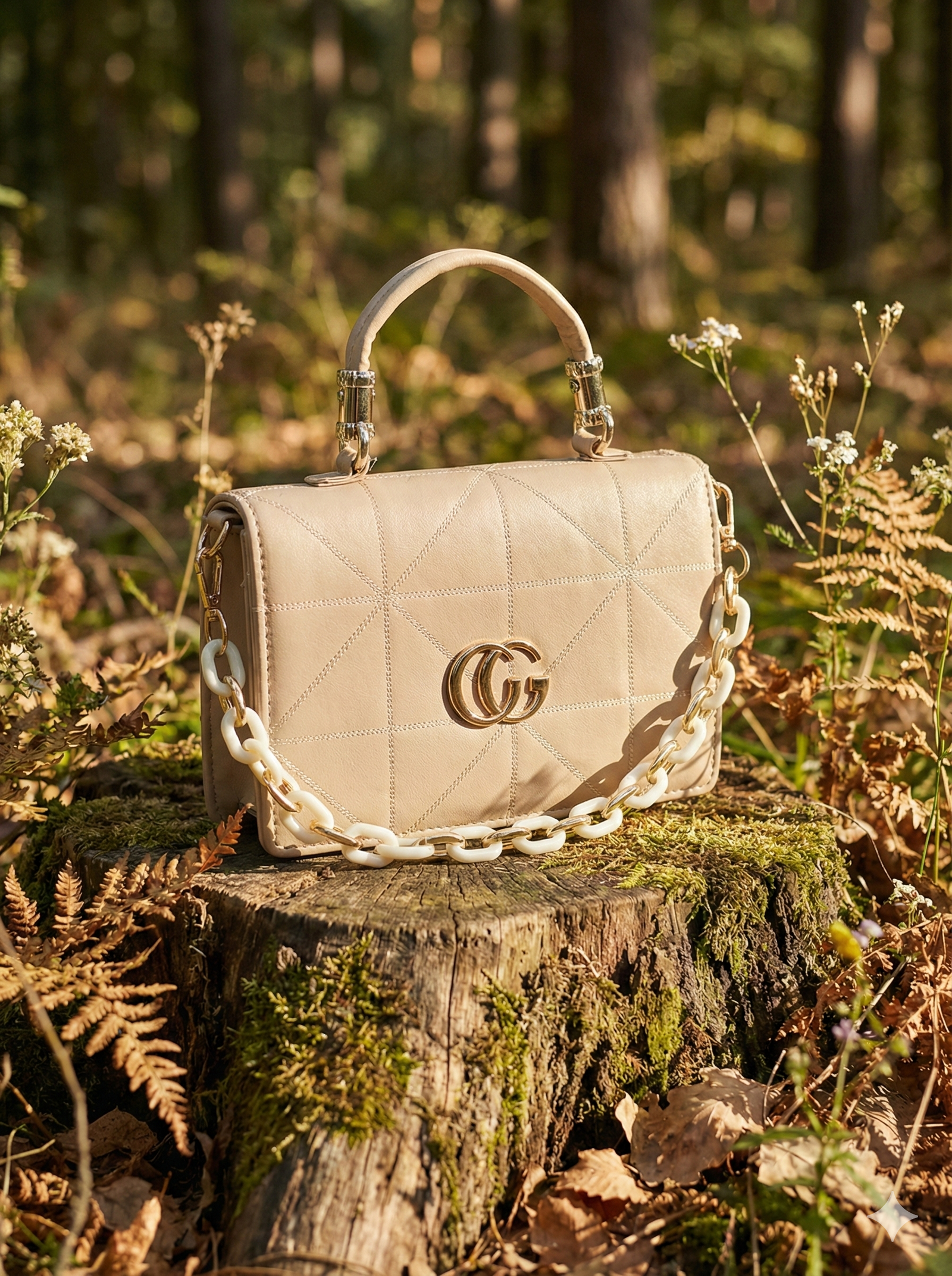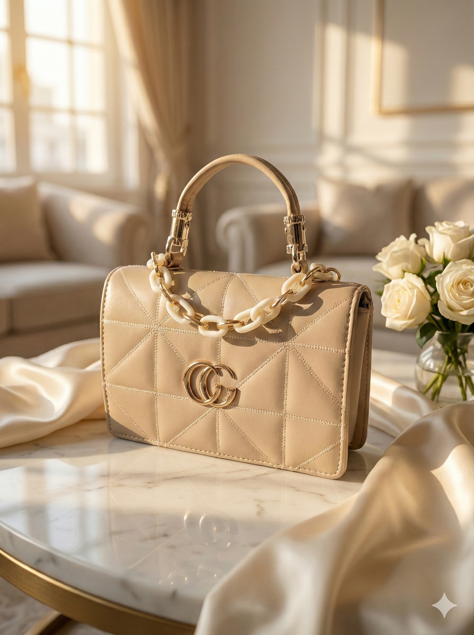 This sophisticated beige handbag features a beautifully quilted design crafted from high-quality faux leather, offering both luxury and durability. The bag is enhanced with a stylish gold accent logo on the front, adding a touch of elegance to its clean, modern silhouette. The combination handle—soft padded top grip paired with a white-and-gold chain—provides a chic, contemporary look while ensuring comfortable carrying. With a structured build and spacious interior, this handbag is perfect for daily use, office wear, events, and outings. Its timeless design makes it an excellent choice for gifting as well.