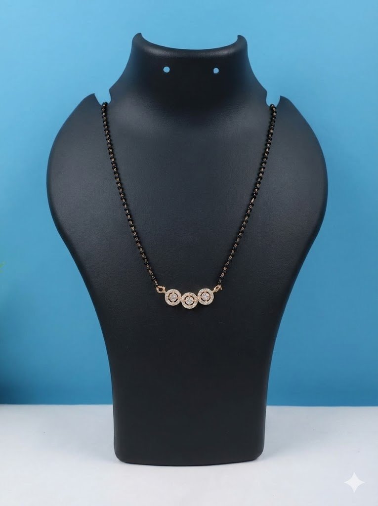 This elegant mangalsutra features a stylish gold-toned chain paired with a beautifully crafted triple circular pendant, each accented with shimmering stones for a refined, modern-traditional look. Designed for everyday comfort, this lightweight piece adds a touch of sophistication to both ethnic and casual outfits. Perfect as a gift for weddings, anniversaries, or daily wear, this mangalsutra blends durability with a timeless aesthetic.