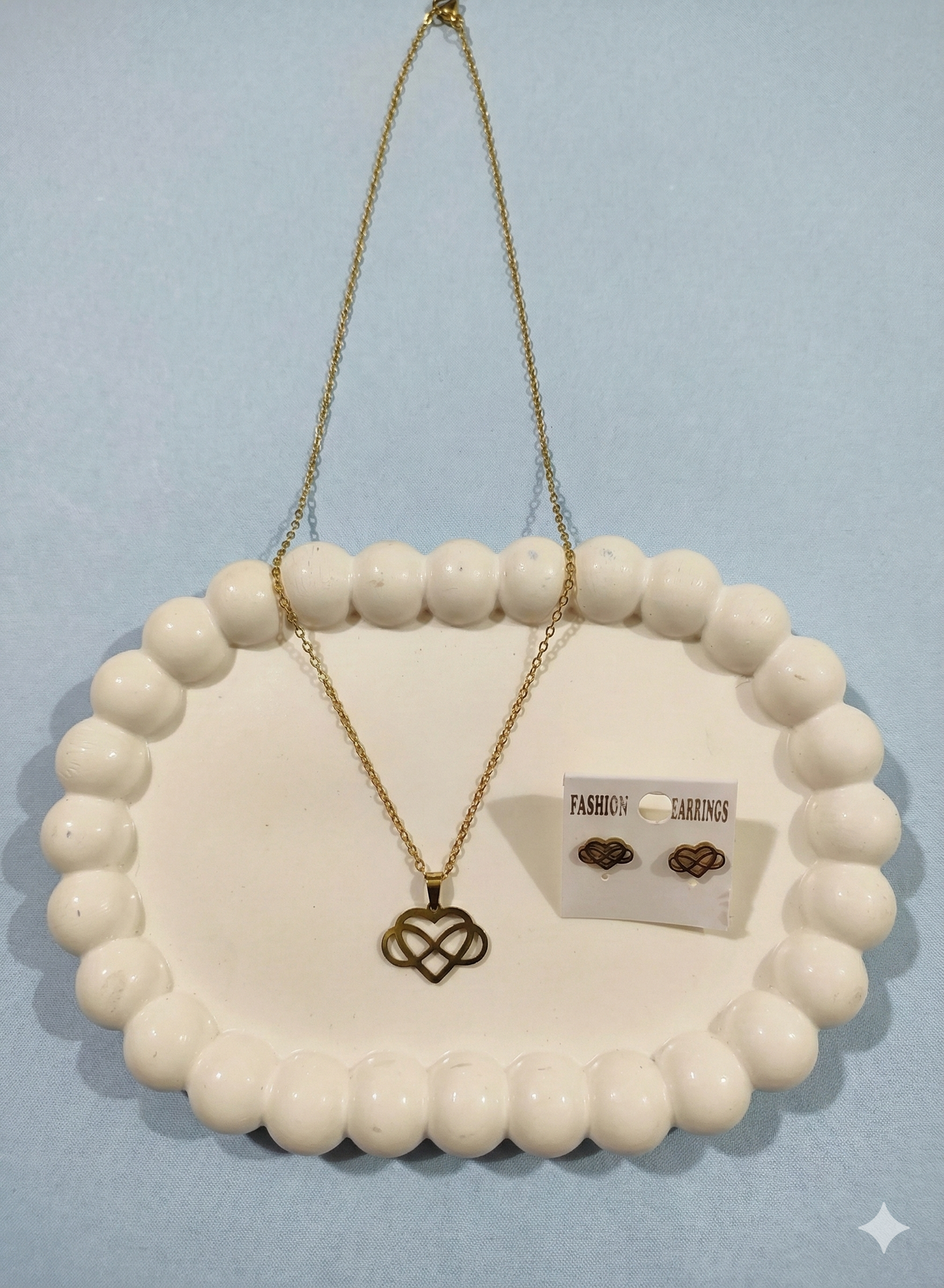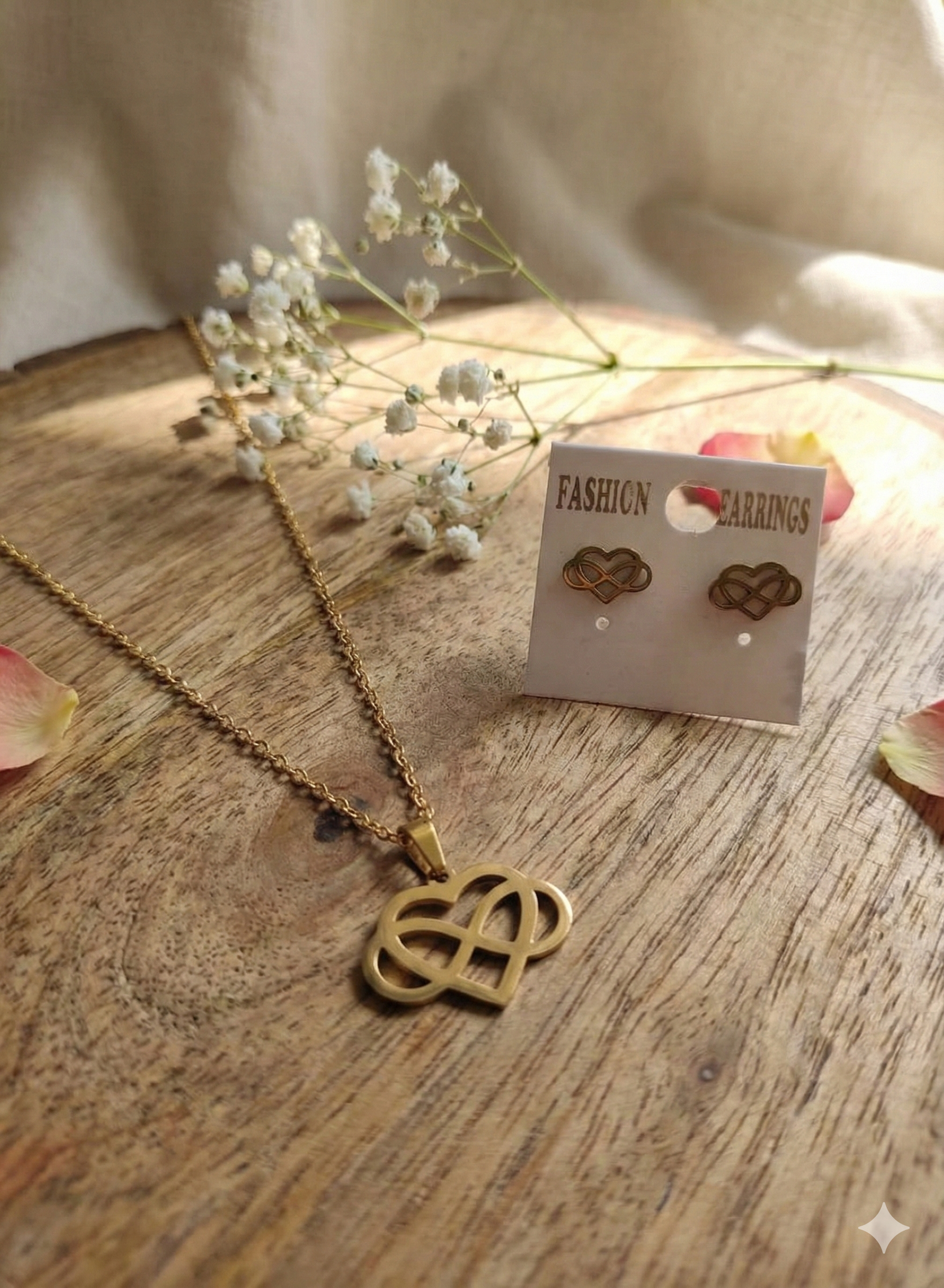 This Stainless Steel Gold – Plated set of Anti Tarnish Heart and Infinte Pendent chain With Earrings Elegant Design For the girl and Women Balances design, Versatility, and craftsmanship, Making it an ideal addition to my collection.